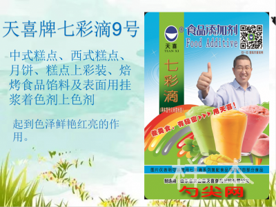 ★商品名:天喜牌七彩滴9型 产品名称:七彩滴牌复配着色剂9 型号:QCD-9 本品按照《食品安全国家标准 食品添加剂使用标准GB2760》及补充规定的品种、应用分类、使用范围、最大使用量、残留量等科学组方,并且按照《食品安全国家标准 复配食品添加剂通则GB26687》精心配制而成。本品已经通过食品生产许可,保障食品安全。用户按照本说明的用法用量生产制作的糕点(食品分类号:07.02)、焙烤食品馅料及表面用挂浆(食品分类号:07.04)既不会超标也不会超量。