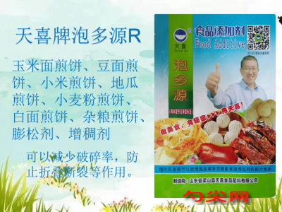 ★功能作用:〔泡多源R型 〕用于玉米面煎饼、豆面煎饼、小米煎饼、地瓜煎饼、小麦粉煎饼、白面煎饼、杂粮煎饼、裹粉、面糊、酥条、薄脆、薄烧饼、炸丸子等各类烘焙看、油炸食品,起到膨松、增稠、稳定等作用。用于煎饼、薄脆、薄烧饼还可以减少破碎率,防止折叠断裂等作用。