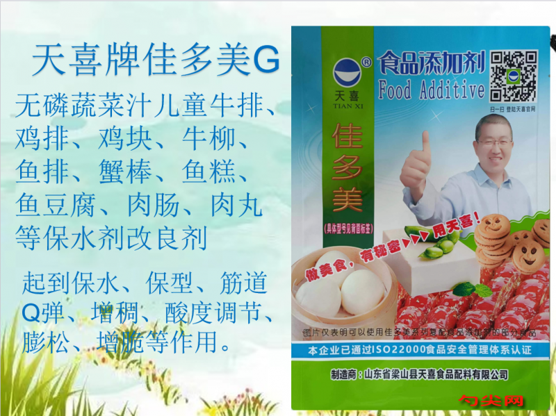 ★功能作用:〔佳多美G型〕用于无磷蔬菜汁儿童牛排、烤肠、脆肠、玉米肠、鸡排、猪排、羊肉卷、牛肉卷、卤牛肉、鱼丸、膨化面包糠、肉饼、肉馅、雪花糠、面包糠、面包屑、鸡块、牛柳、鱼排、蟹棒、鱼糕、鱼豆腐、肉肠、肉丸、面糊、辣条等无磷肉制品、水产品、各类食品,起到保水、保型、筋道Q弹、增稠、酸度调节、膨松、增脆等作用。〔佳多美G型〕比较适合高出品率的无磷肉制品。