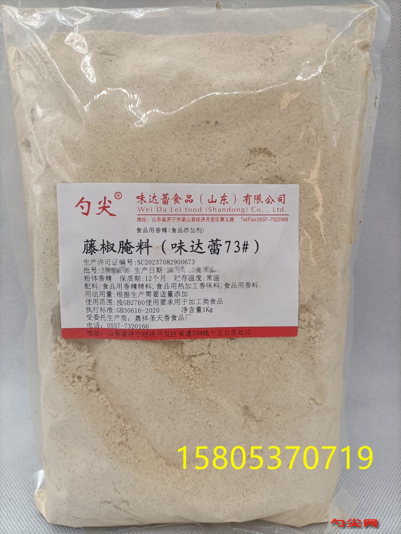 ★商品名:味达蕾73# 产品名称:藤椒腌料 型号: 本品按照《食品安全国家标准 食品添加剂使用标准GB2760》及补充规定的品种、应用分类、使用范围、最大使用量、残留量等科学组方,并且按照《食品安全国家标准 食品用香精GB 30616-2014》精心配制而成。本品已经通过食品生产许可,保障食品安全。用户按照本说明的用法用量生产制作的预制肉制品(食品分类号:08.02)、熟肉制品(食品分类号:08.03)、复合调味料(食品分类号:12.10)既不会超标也不会超量。