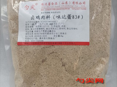 ★商品名:味达蕾83# 产品名称:卤鸡肉料 型号: 本品按照《食品安全国家标准 食品添加剂使用标准GB2760》及补充规定的品种、应用分类、使用范围、最大使用量、残留量等科学组方,并且按照《食品安全国家标准 食品用香精GB 30616-2014》精心配制而成。本品已经通过食品生产许可,保障食品安全。用户按照本说明的用法用量生产制作的预制肉制品(食品分类号:08.02)、熟肉制品(食品分类号:08.03)、复合调味料(食品分类号:12.10)既不会超标也不会超量。