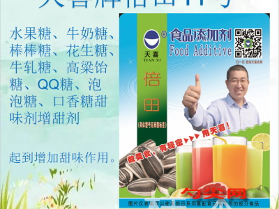 ★商品名:天喜牌倍田11型 产品名称:倍田牌复配甜味剂11 型号:BT-11 本品按照《食品安全国家标准 食品添加剂使用标准GB2760》及补充规定的品种、应用分类、使用范围、最大使用量、残留量等科学组方,并且按照《食品安全国家标准 复配食品添加剂通则GB26687》精心配制而成。本品已经通过食品生产许可,保障食品安全。用户按照本说明的用法用量生产制作的糖果(食品分类号:05.02 )既不会超标也不会超量。