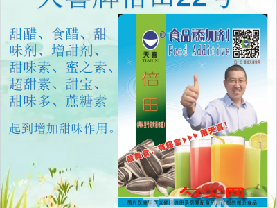 ★商品名:天喜牌倍田22型 产品名称:倍田牌复配甜味剂22 型号:BT-22 本品按照《食品安全国家标准 食品添加剂使用标准GB2760》及补充规定的品种、应用分类、使用范围、最大使用量、残留量等科学组方,并且按照《食品安全国家标准 复配食品添加剂通则GB26687》精心配制而成。本品已经通过食品生产许可,保障食品安全。用户按照本说明的用法用量生产制作的醋(食品分类号:12.03)既不会超标也不会超量。