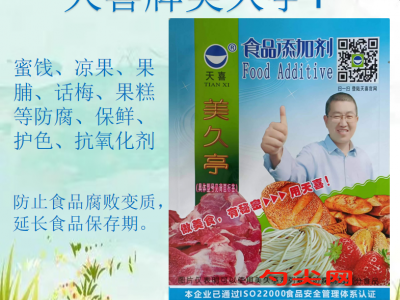 ★商品名:天喜牌美久亭T 产品名称:美久亭牌复配防腐剂25 型号:MJT-T 本品按照《食品安全国家标准 食品添加剂使用标准GB2760》及补充规定的品种、应用分类、使用范围、最大使用量、残留量等科学组方,并且按照《食品安全国家标准 复配食品添加剂通则GB26687》精心配制而成。本品已经通过食品生产许可,保障食品安全。用户严格按照本说明的用法用量生产制作的蜜饯凉果(食品分类号:04.01.02.08)既不会超标也不会超量。